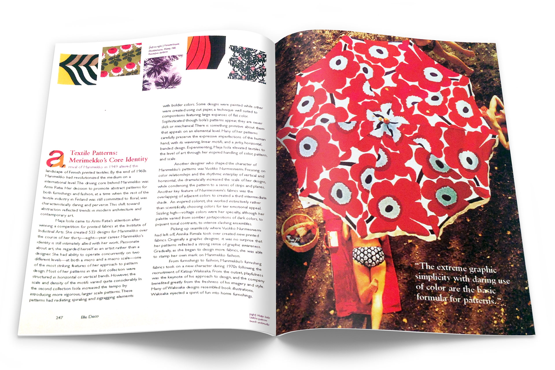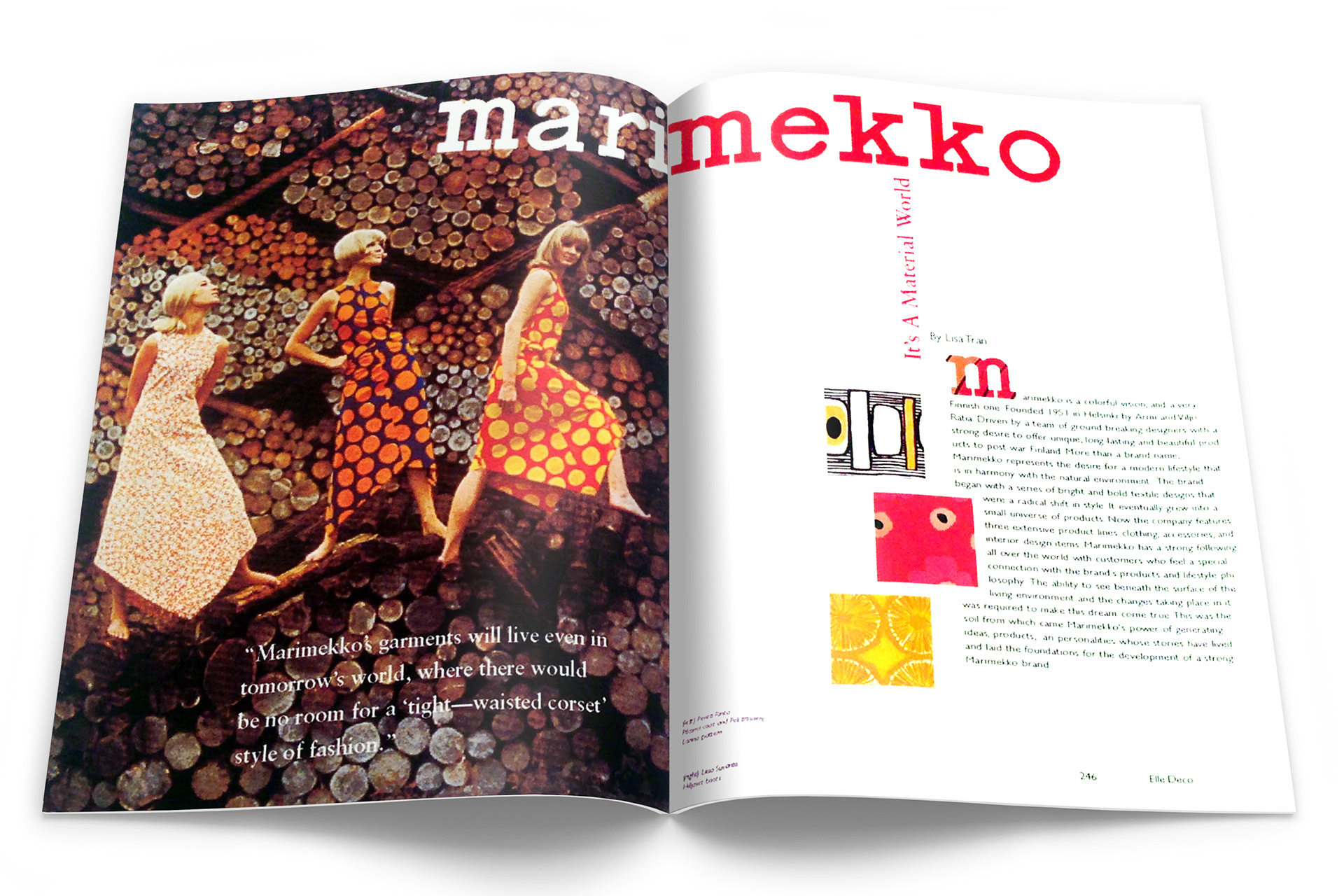 Designed a double-page spread highlighting the distinctive patterns and designs of the Finnish design company Marimekko, capturing the essence of their bold aesthetic and timeless appeal. Personal work.